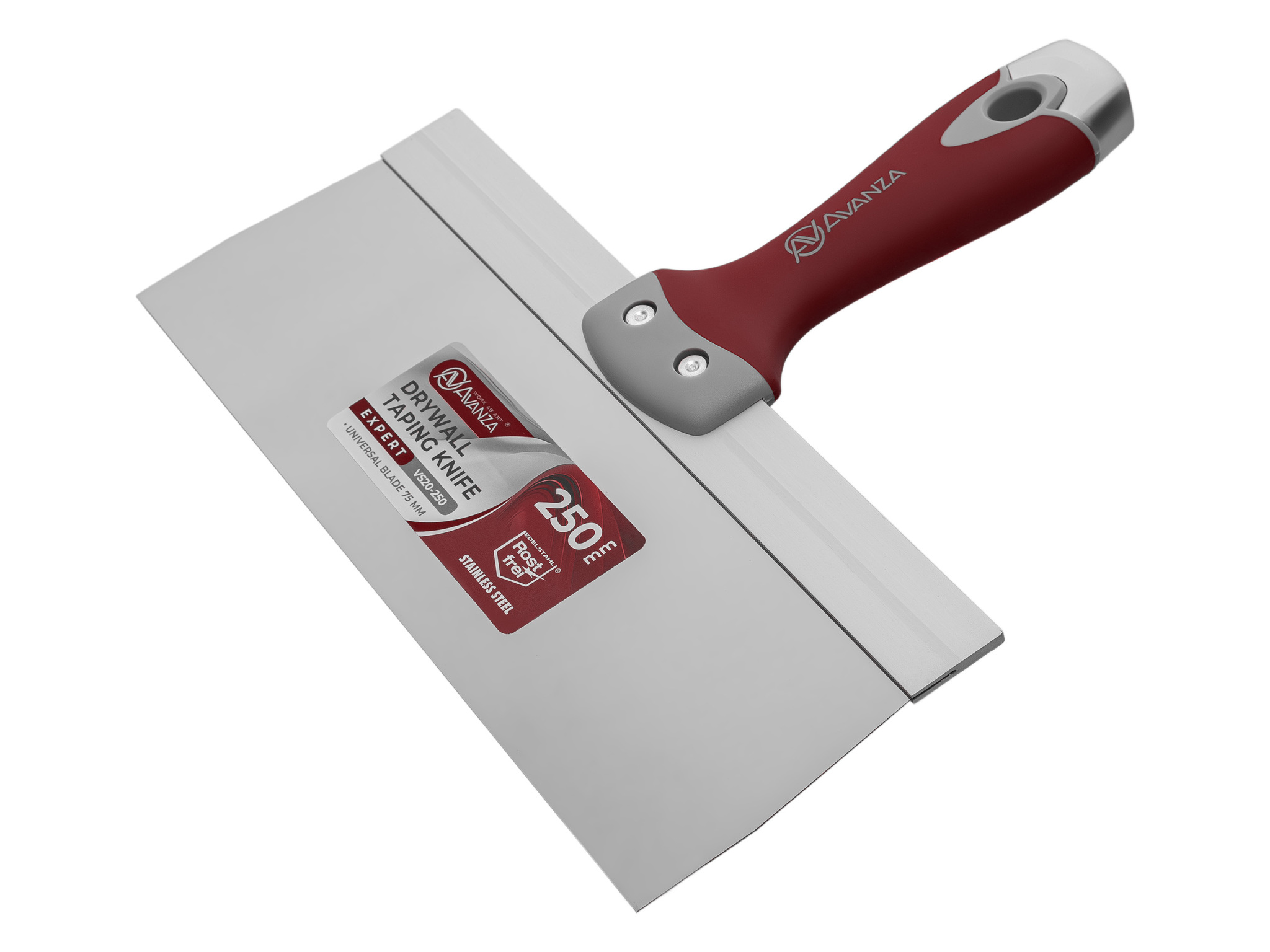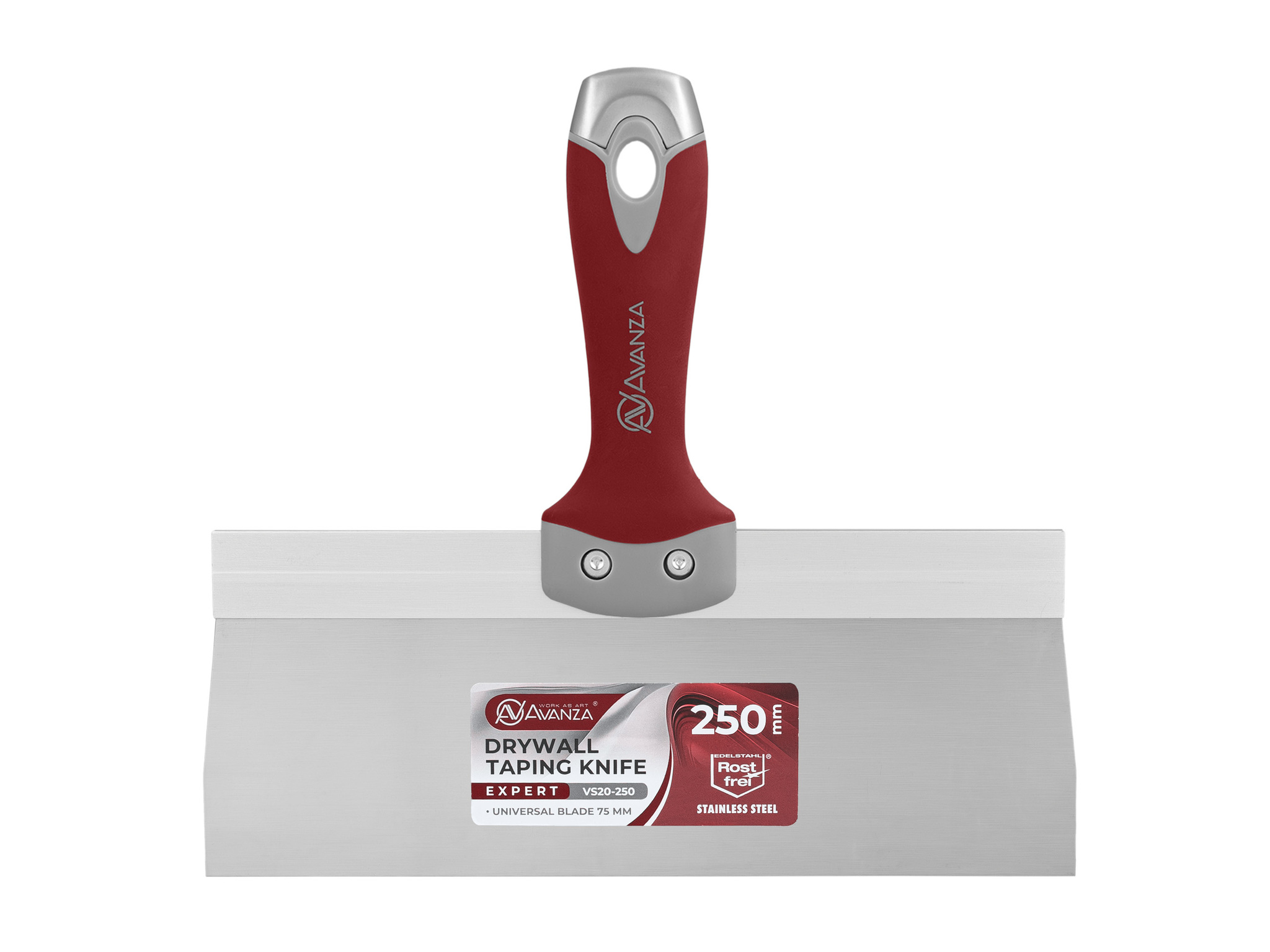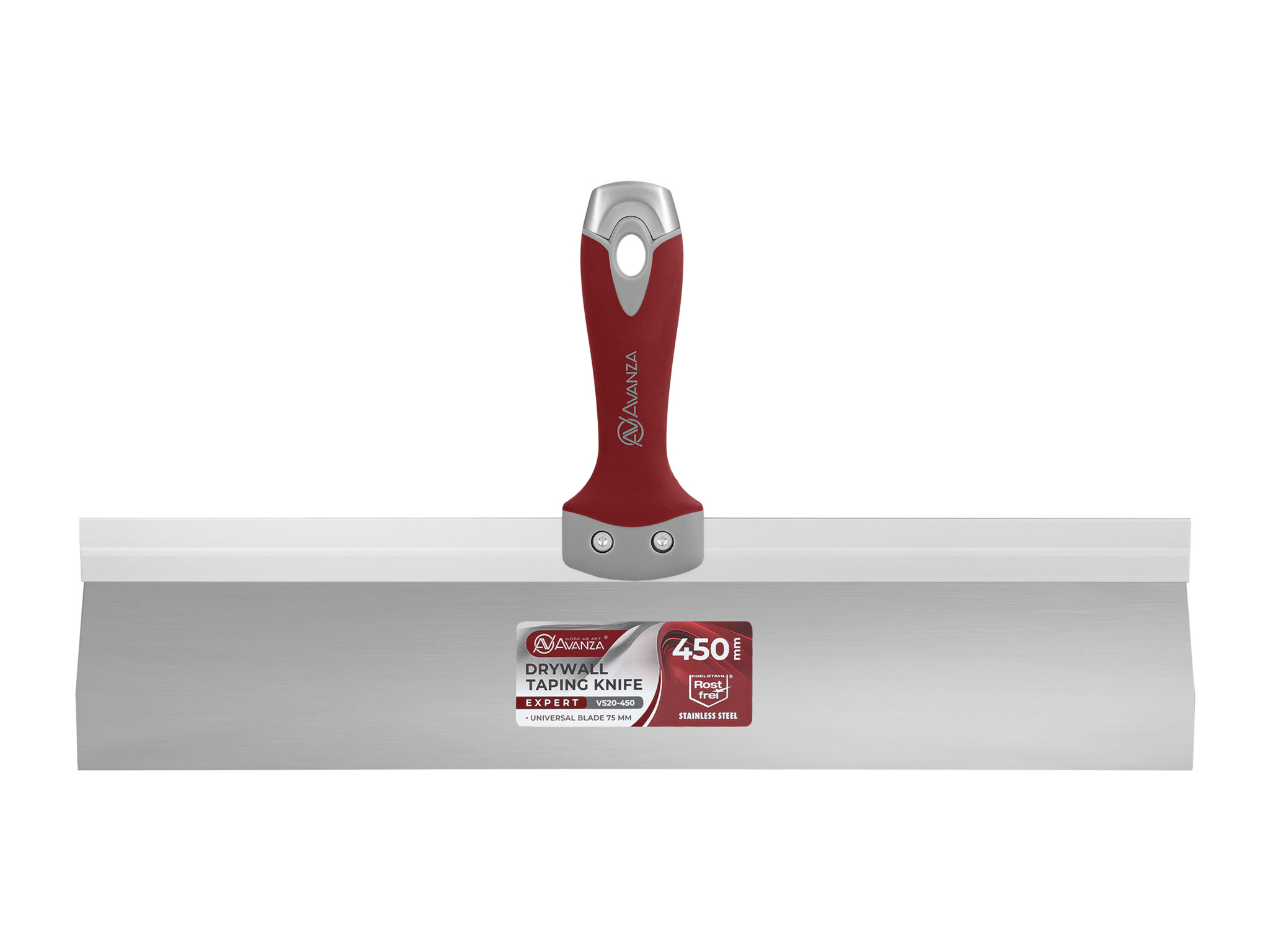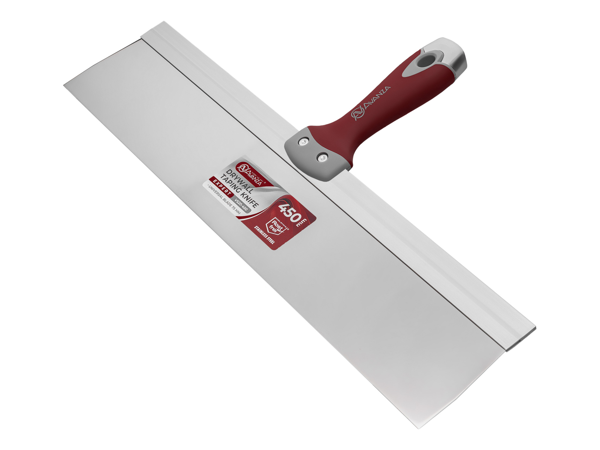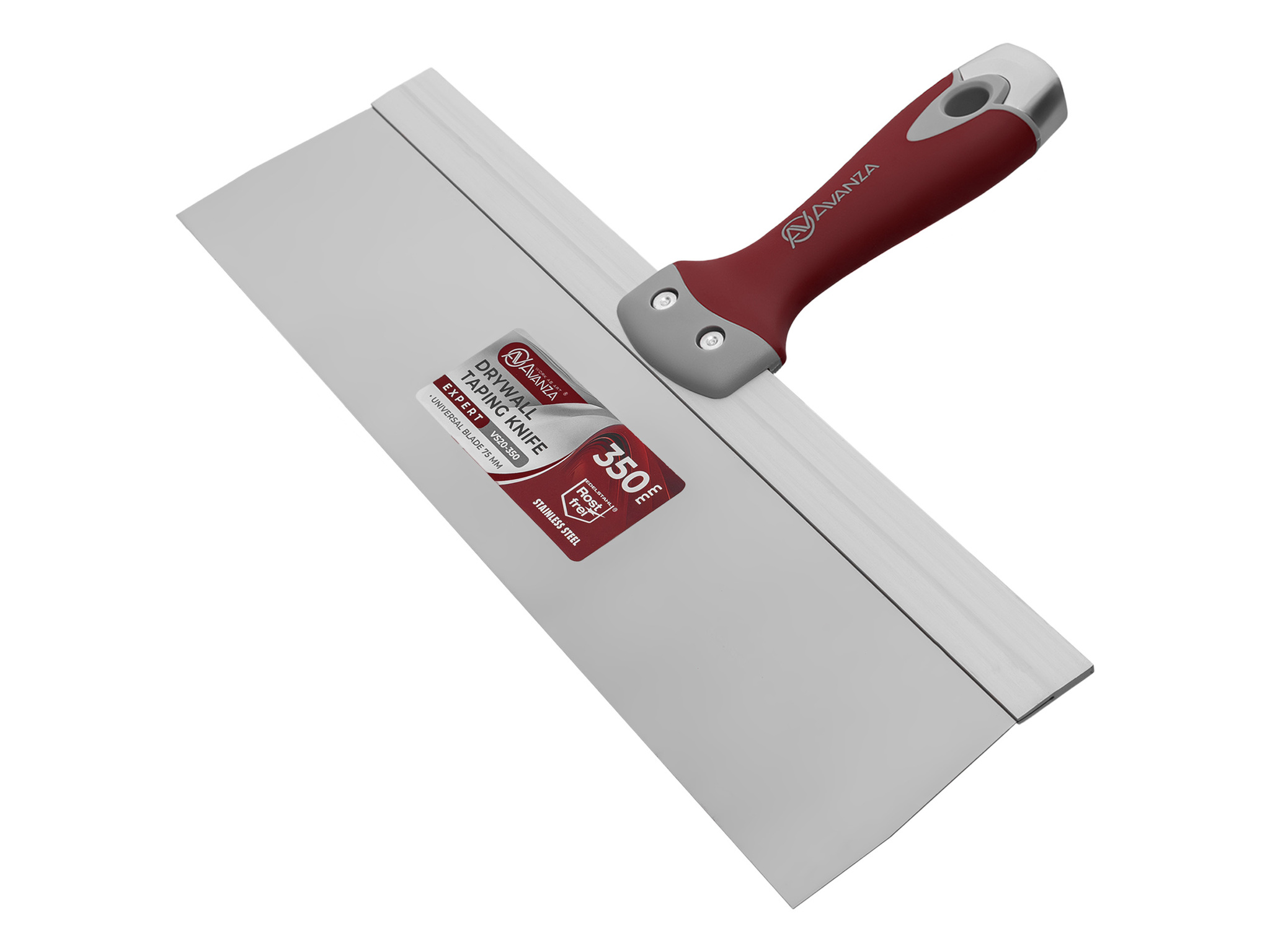 Шпатель фасадный Avanza шириной 350 мм оснащен жестким лезвием высотой 75 мм. Лезвие произведено из нержавеющей стали толщиной 0.5 мм и надежно зафиксировано в рукотке при помощи алюминиевой рамки, сохрянящей геметрию лезвия на протяжении работы.